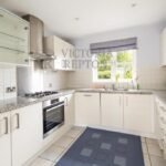The kitchen is fitted with modern white goods, including a frost-free AEG fridge/freezer, Bosch PerfectDry standalone dishwasher, AEG gas hob and hood, and an AEG oven, complemented by a marble/quartz worktop for easy maintenance.